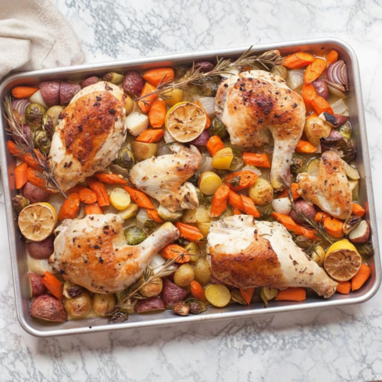 In a bowl, whisk together the olive oil, lemon juice, lemon zest, garlic, thyme, rosemary, salt, pepper, and paprika. Rub most of the mixture over the chicken thighs, making sure they’re well coated. This kind of lemon-garlic-herb mixture is a common base for sheet pan chicken because it keeps the flavor fresh and bright while the chicken roasts.Season the vegetables.